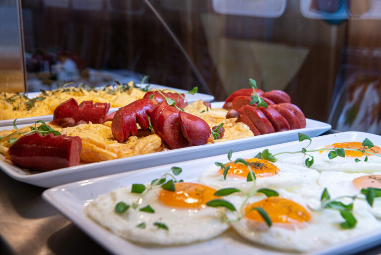 Me serverer frukost med historisk sus til dei som overnattar. Til lunsj tilbyr me ein variert meny, perfekt for ein rask og hyggeleg pause.