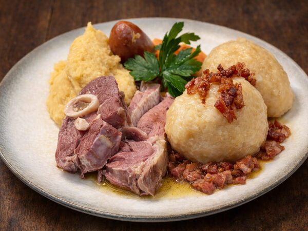 Svine knoke, serveres med rødkål, stekt sopp,løk, ovnsbakte shery-tomat og båtpoteter(9,10)